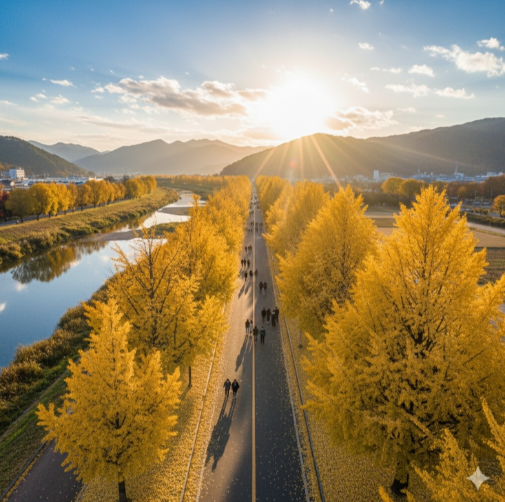 - 충남 아산 곡교천 은행나무길: 황금빛 터널 아래 즐기는 낮과 밤의 산책