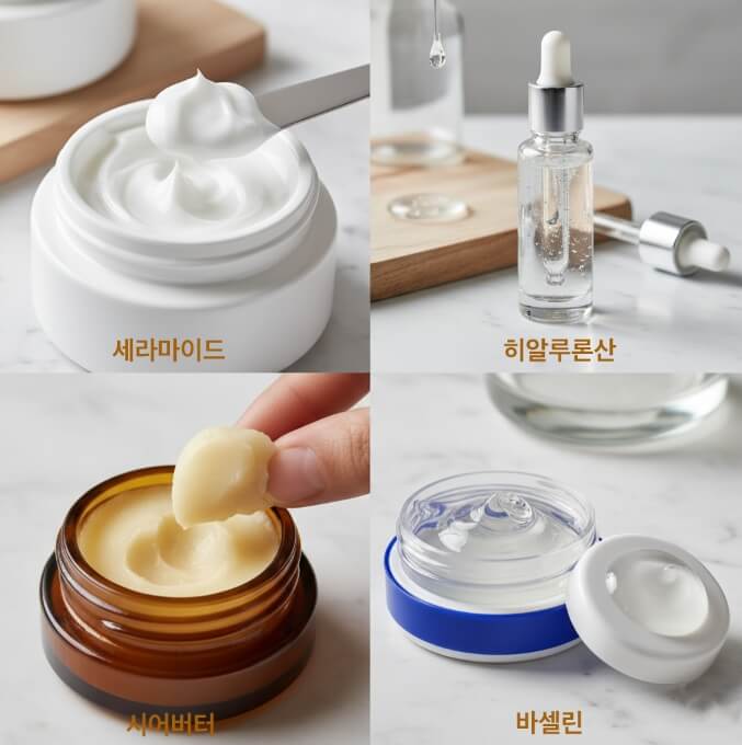 - 페트롤라툼(바셀린) : 수분 증발을 가장 강력하게 막아주는 보호막을 형성합니다.