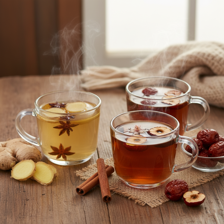 - 생강차 : 핵심 성분인 진저롤과 쇼가올이 몸에서 열을 발생시키고 혈액 순환을 자극합니다.
