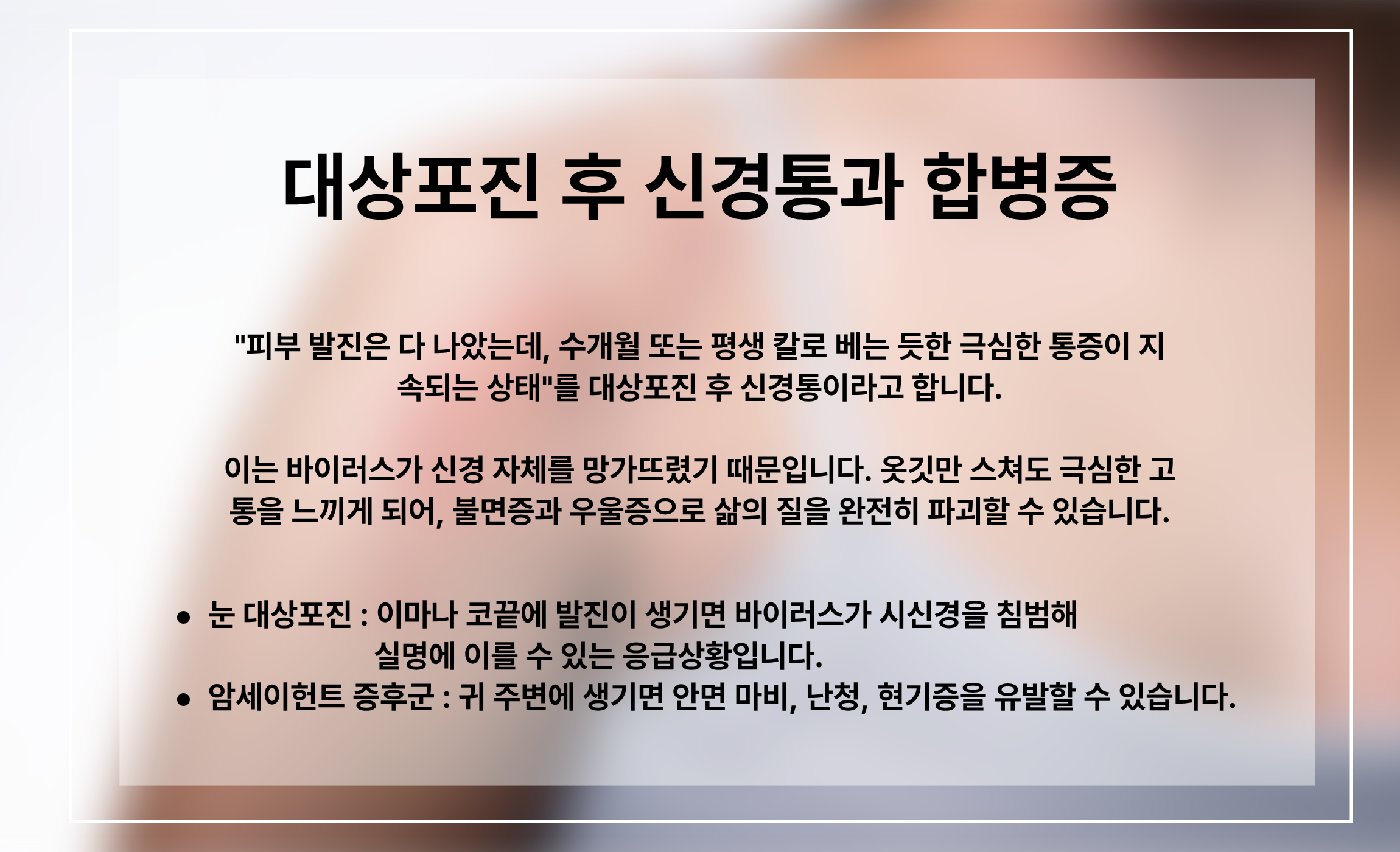 "피부 발진은 다 나았는데, 수개월 또는 평생 칼로 베는 듯한 극심한 통증이 지속되는 상태"를 대상포진 후 신경통이라고 합니다.